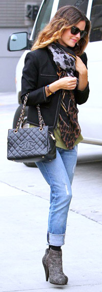 Her style is often referred to as “boho” though this look is a little more chic. Her outfits are often characterized by a perfectly polished, but effortless street style, and this is no exception. She pulls together several fall essentials to create a look anyone could put together with pieces in their closet. The two-toned leopard scarf emboldens the classic jacket and works perfectly with the olive green tank.