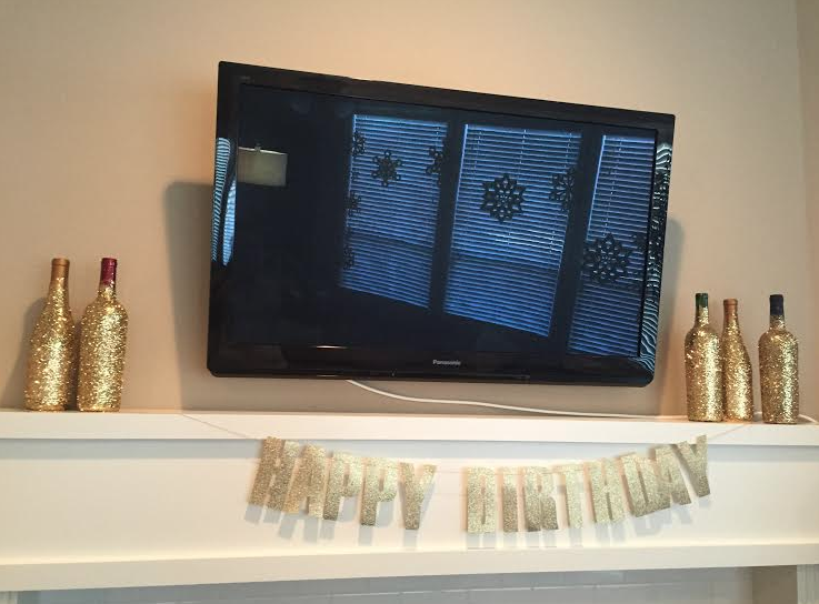 {These gold wine bottles were my favorite and I can’t wait to use them again. They were also insanely easy to make. Take the wine bottle, cover it using spray glue, then pour TONS of glitter on top. Voila!}