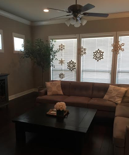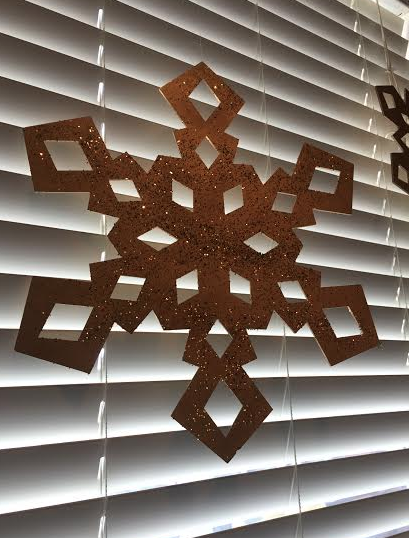 {Gold spray painted and glittered snowflakes. Bought the wooden snowflakes from a local boutique, then DIYed them gold!}