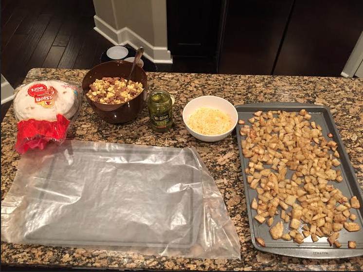 - Make an assembly line – tortilla, cheese, followed by a small handful of potatoes and a scoop of the egg/sausage mixture. Roll the tortilla up.