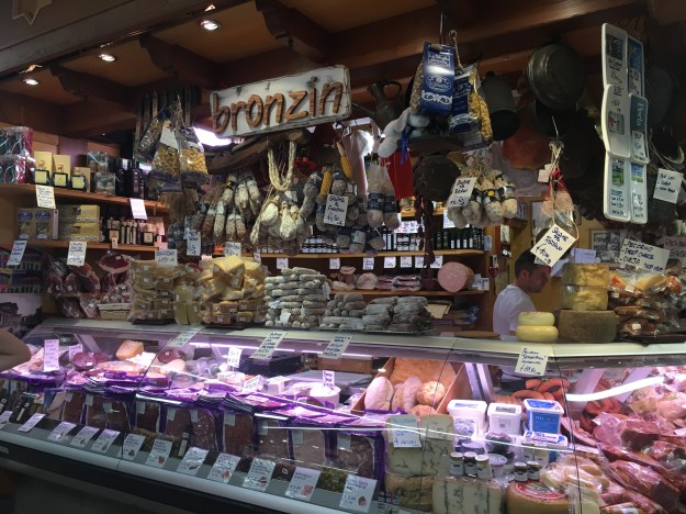 [Very cool market we stopped in for breakfast – bottom floor was fresh meats, cheeses, veggies and fruits like a farmer’s market; top floor was cafes and restaurants – this cappucino and ham + brie croissant was delicious.]