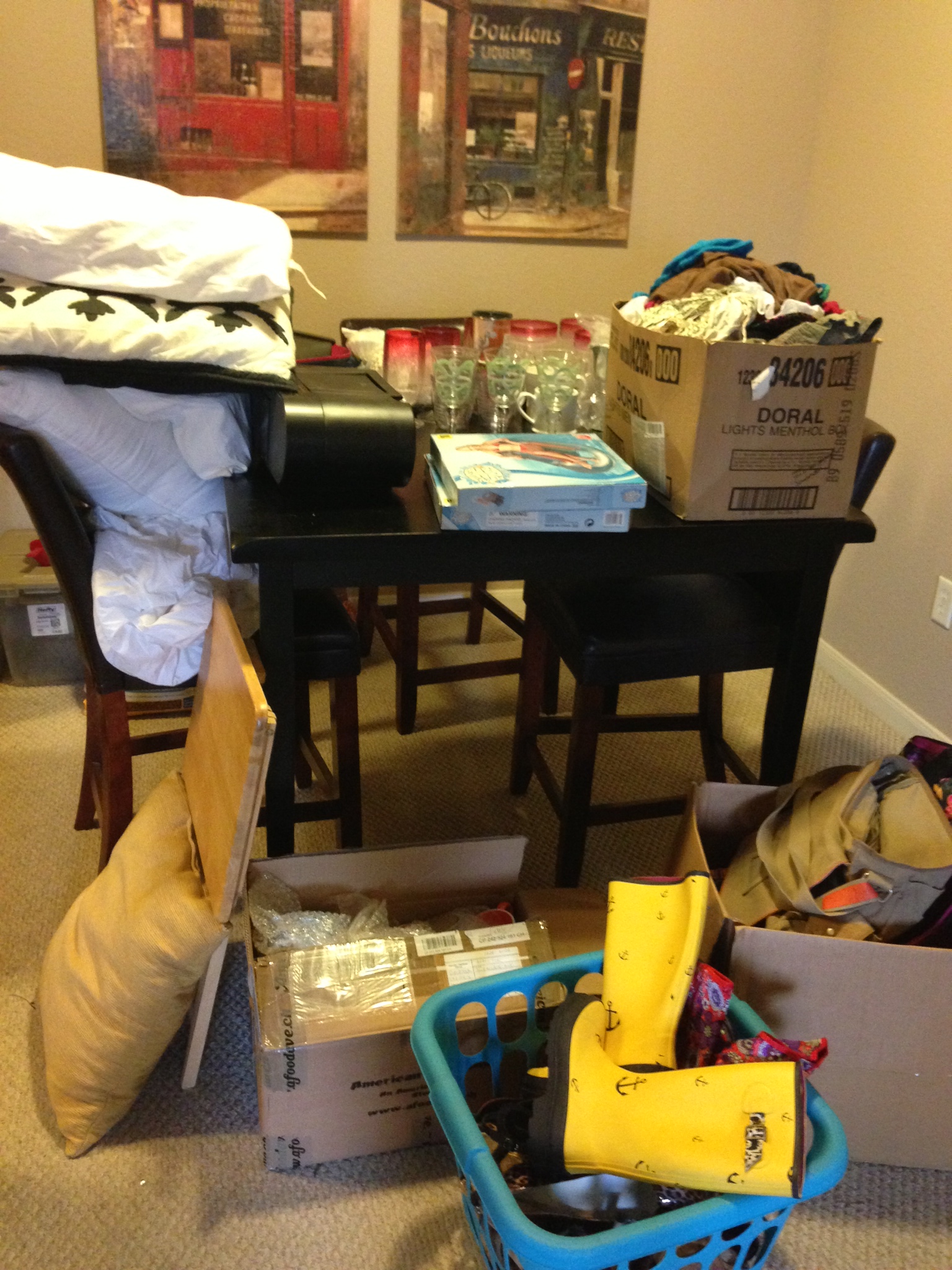 Here’s a photo of some of the stuff we’re giving away – clothes, shoes, purses/backpacks, kitchenware, blankets, pillows. This photo does not include the two huge trashbags filled with clothes we have.