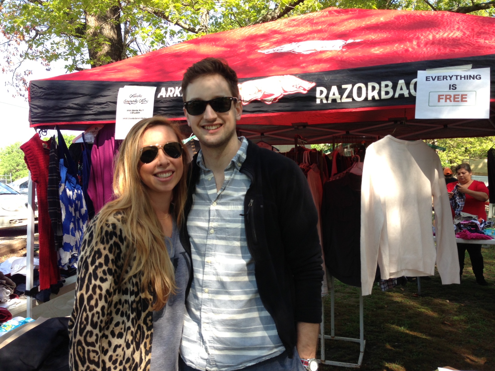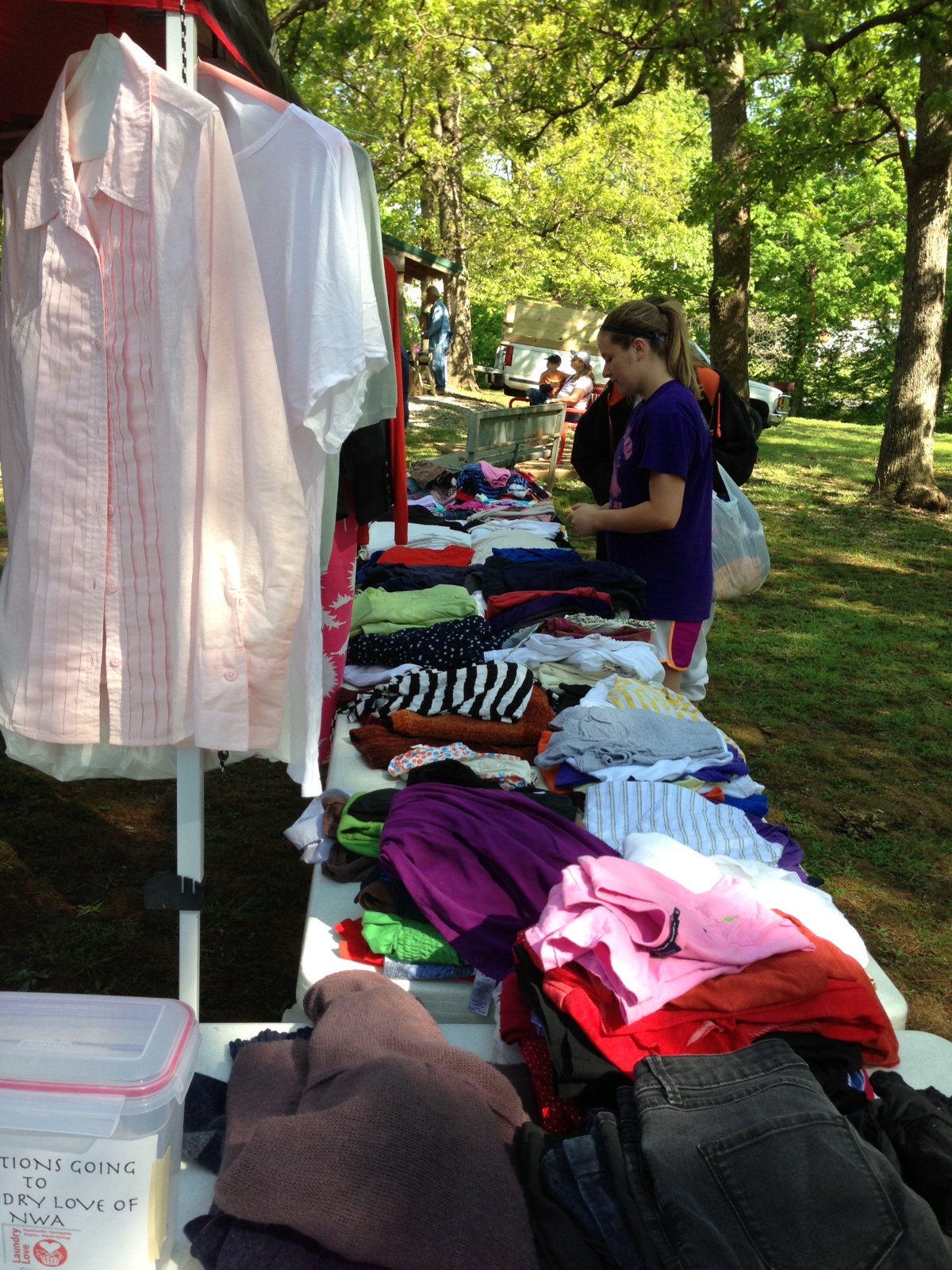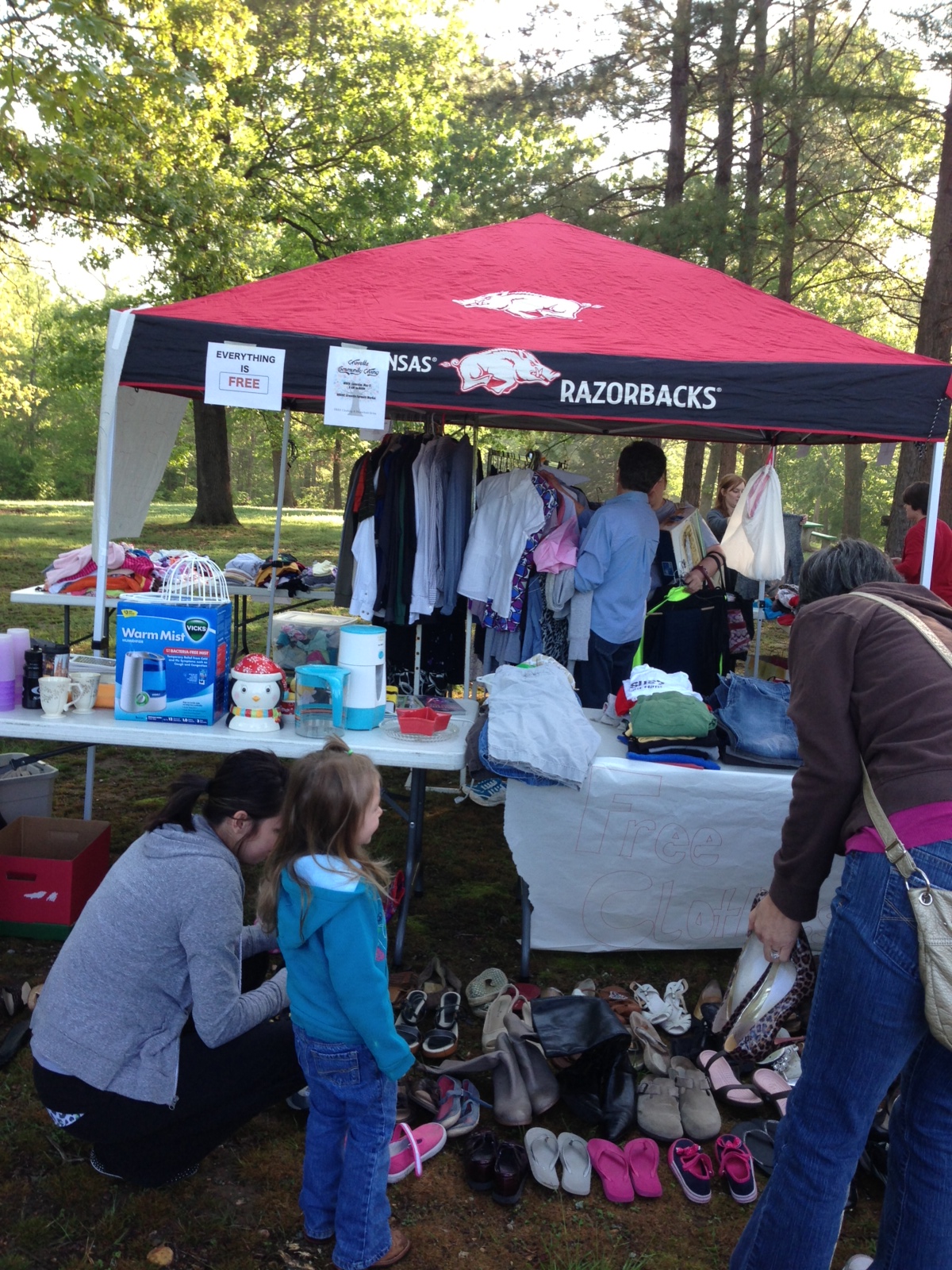 Hi friends, remember when we were doing our 7 challenge? We cleaned out our closets and our apartment and had an abundance of stuff to give away, along with our Community Group. We gave all the household items to Havenwood, but we all kept the clothes planning to do a free clothing giveaway. Well, it finally happened. We planted ourselves in the middle of the Gravette Farmer’s Market with a tent full with clothes, shoes, accessories and signs that said FREE. We weren’t sure exactly how it was going to work. We didn’t know how many people would stop by, if people would want to give money for the clothes, if they would let pride get in their way or if they would take everything in one swoop. I’m here to say, it was a HUGE success.
