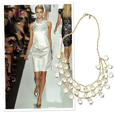 Though lucite was really a big trend last spring, it’s still hot for 2011. Lucite is a solid, transparent plastic, seen everywhere from necklaces to earrings to bangles to high heels. The fun look is a mix of sophistication and innocence. (Aren’t these similar to the plastic bangles I wore growing up?)