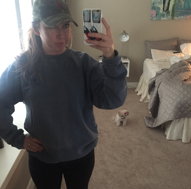 [I call this my, college-student look – UA baseball cap, fayettechill sweatshirt, uggs]